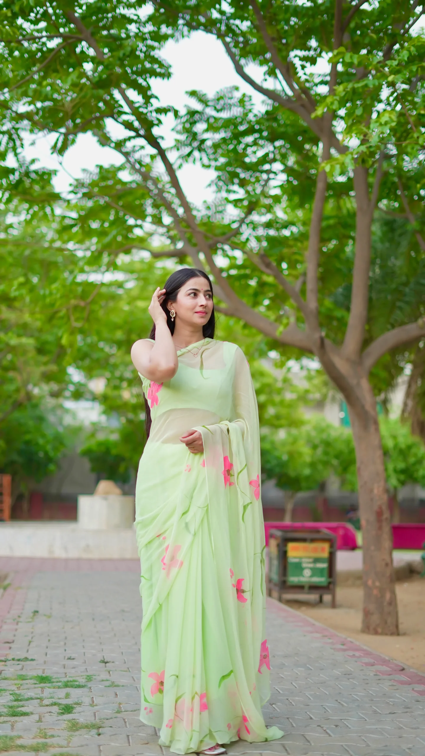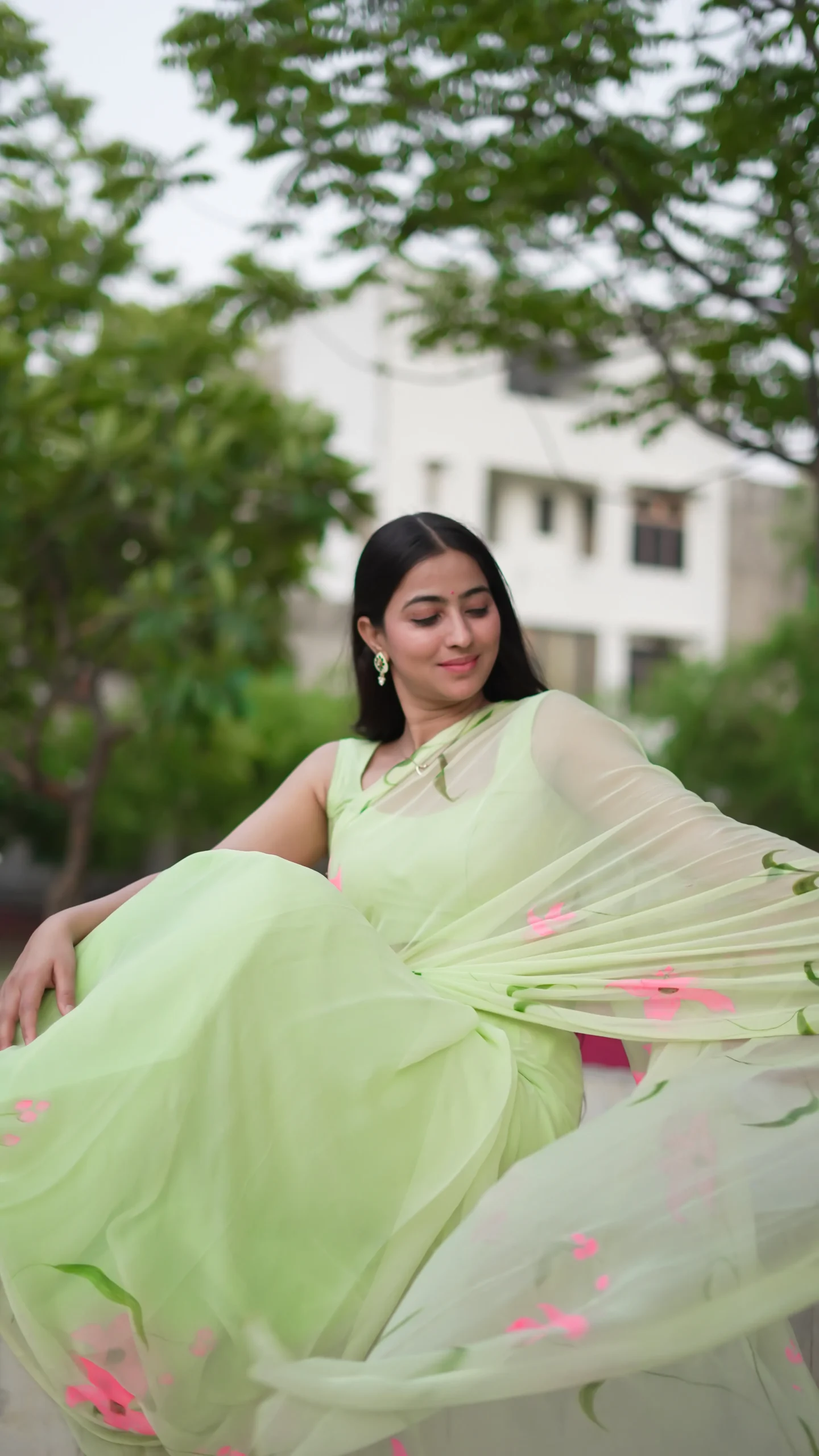 A breezy hand-painted chiffon saree in pastel green with soft pink florals, designed for effortless elegance and comfort.