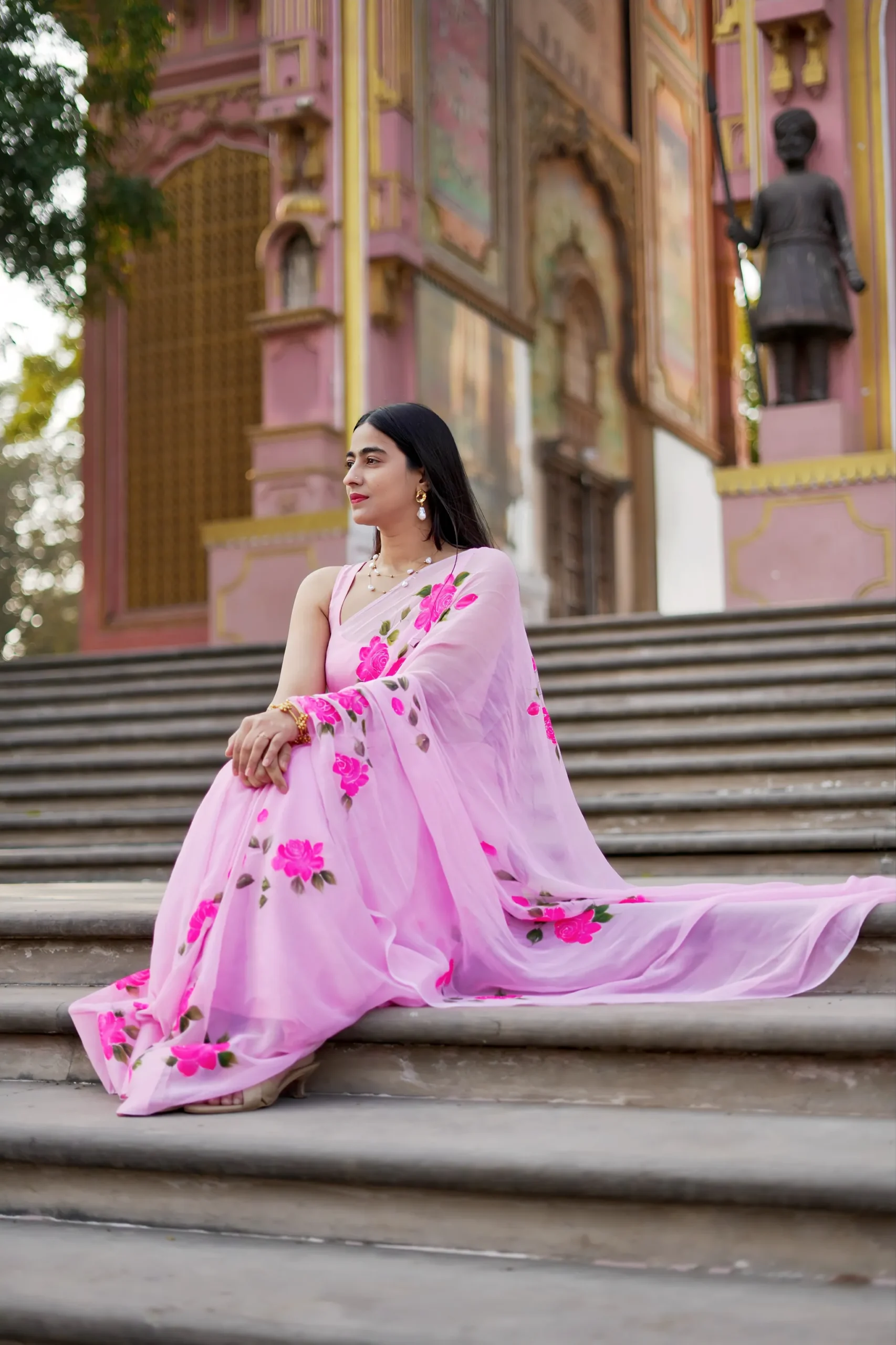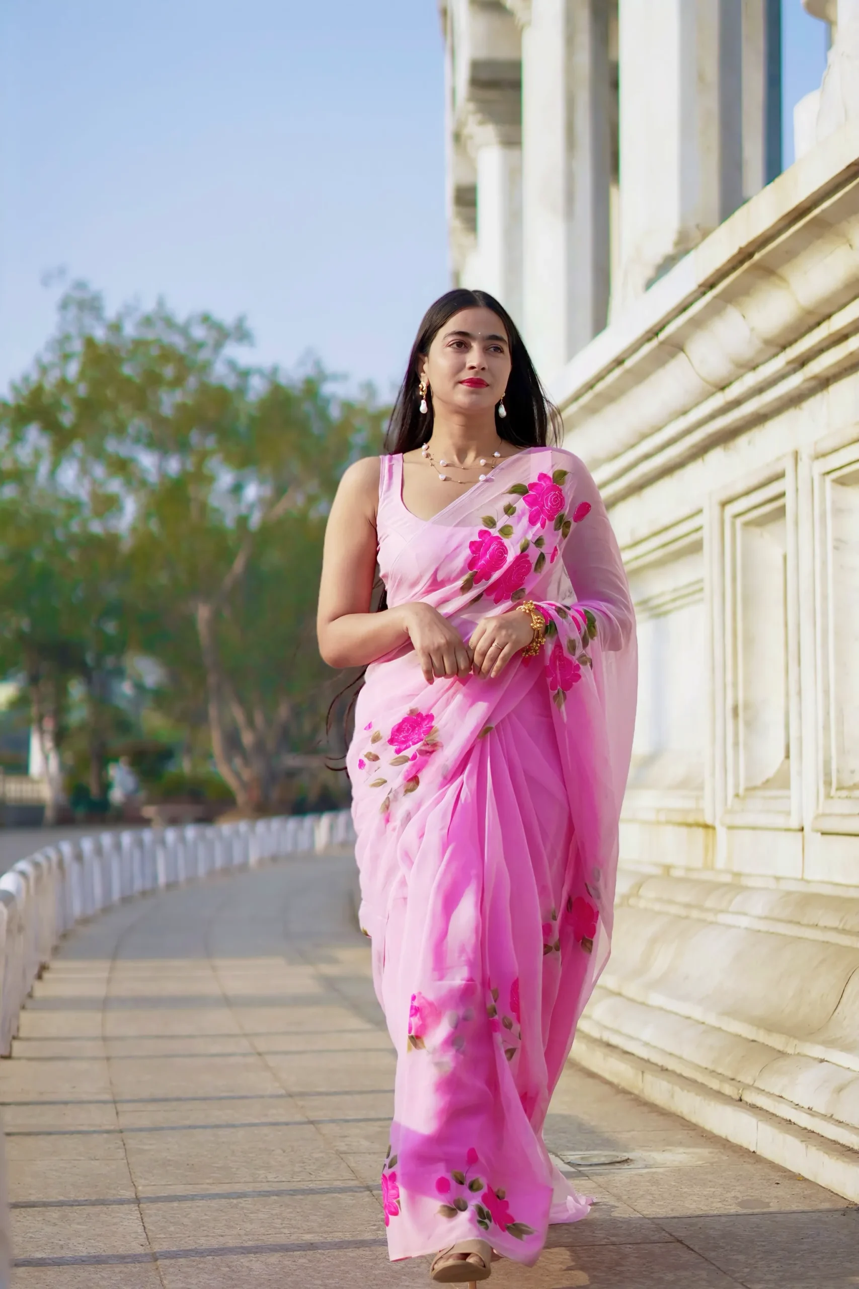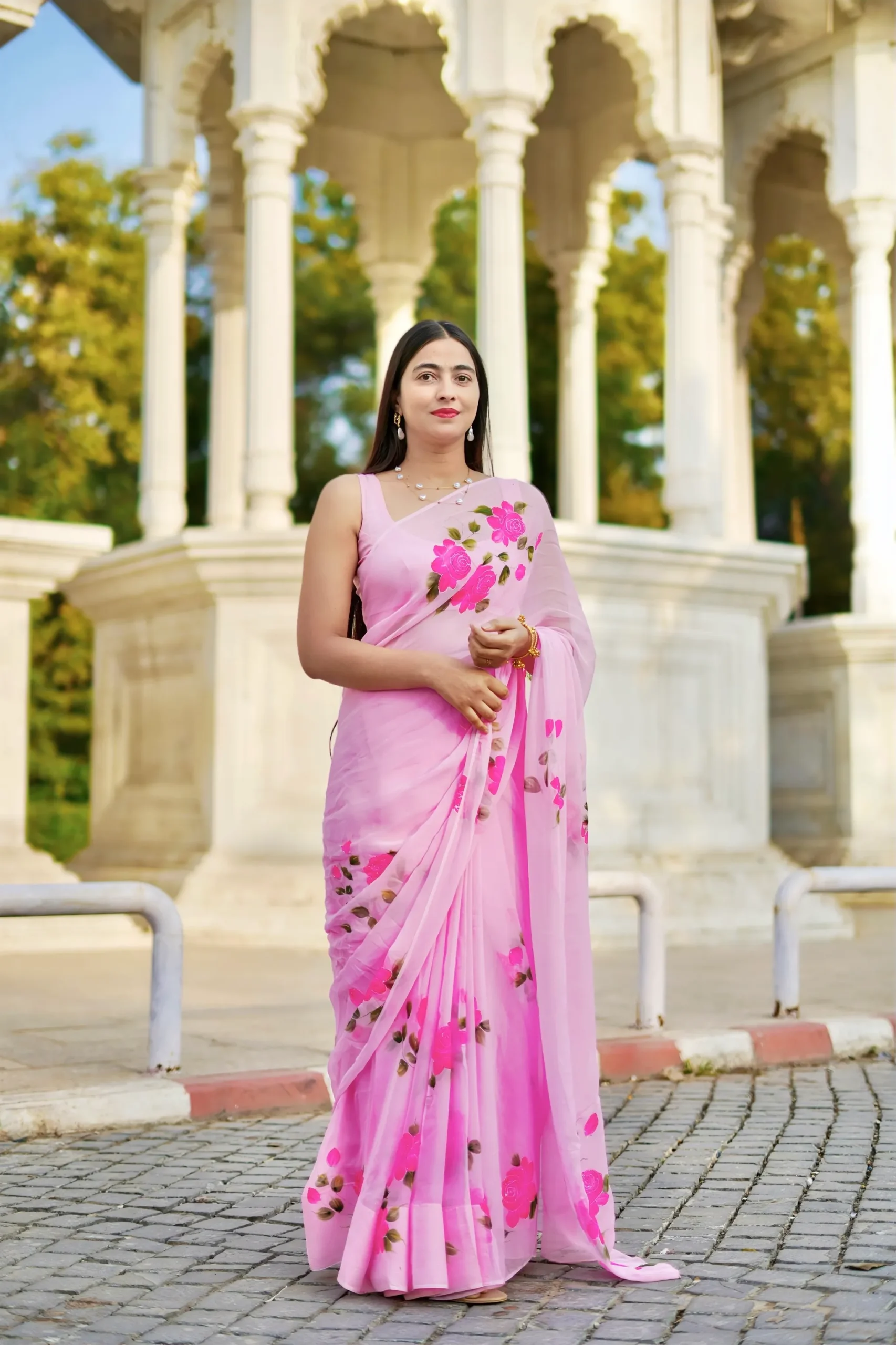 The soothing pink base paired with vibrant rose floral accents creates a timeless appeal, while the airy chiffon fabric flows beautifully with every movement. Perfect for daytime celebrations, festive gatherings, and elegant occasions, this saree offers comfort, grace, and handcrafted artistry in every detail.