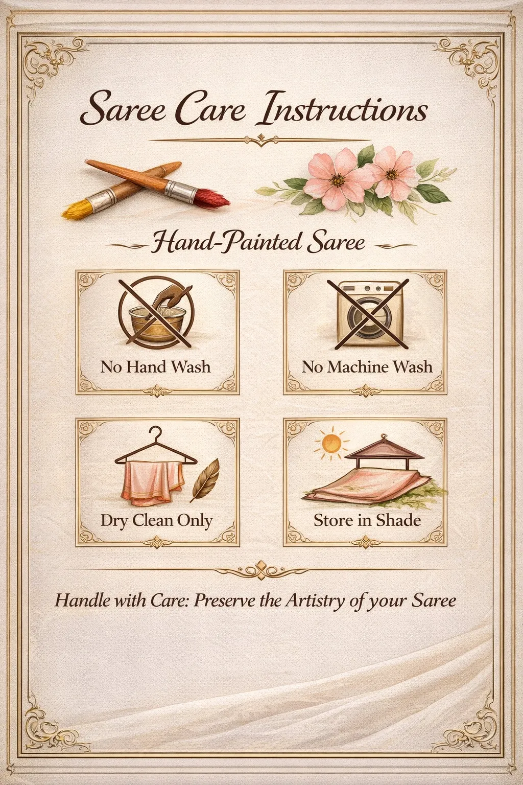 Delicate, graceful, and effortlessly elegant, this hand-painted chiffon saree is a celebration of soft femininity. Crafted in lightweight chiffon fabric, the saree features beautiful hand-painted floral motifs that add a fresh and romantic charm to the drape.