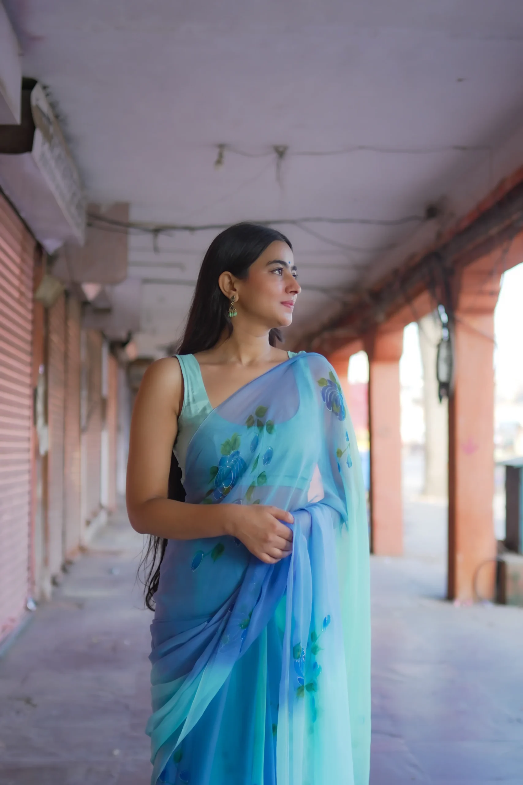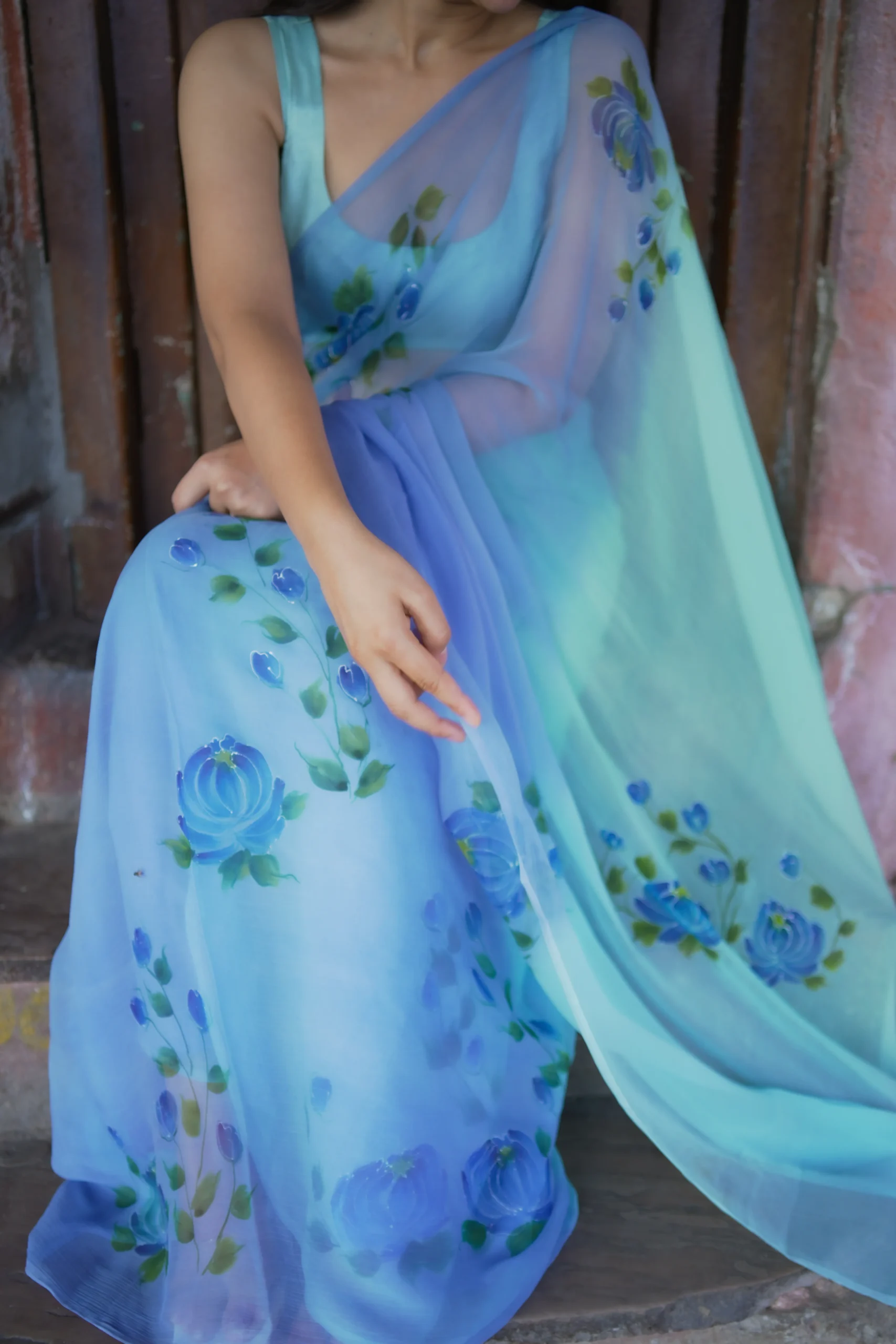 A lightweight hand-painted chiffon saree adorned with soft blue floral motifs, designed for effortless elegance and graceful draping.